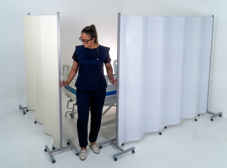O biombo sanfonado é um acessório fundamental dentro de leitos em clínicas, hospitais e demais estabelecimentos assistenciais de saúde (EAS). Temos as versões de biombos sanfonados fixos e totalmente móveis, ideais para todos tipos de utilização em UTI.
